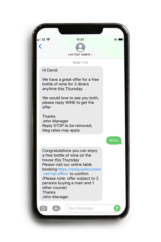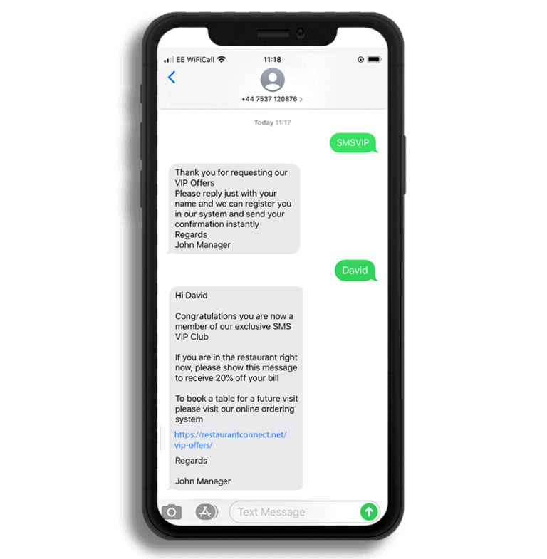 Because this customer is new, we make it as quick and easy as possible to book a table or order a meal online, we include a link to your own online ordering system and the new customer can order and get confirmation in real time by phone and email